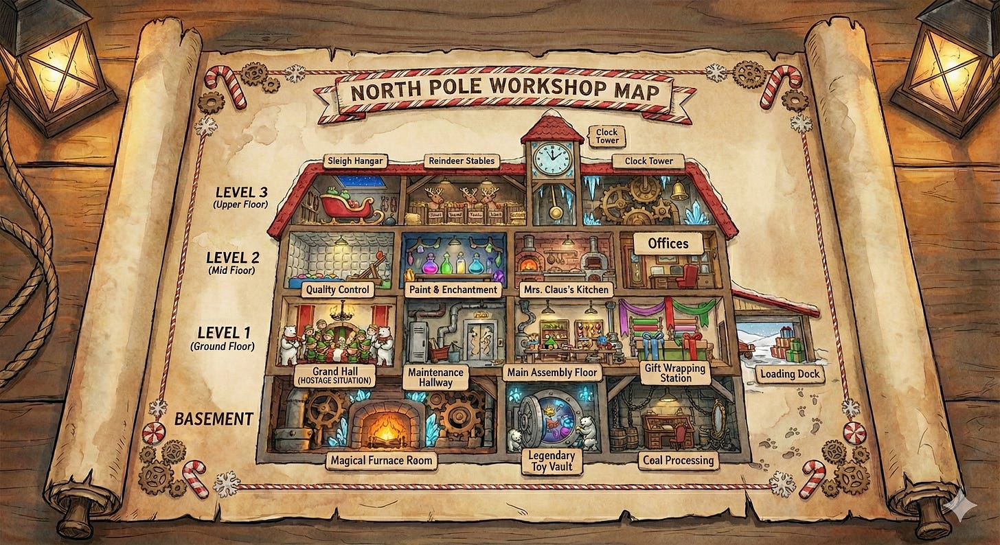 I’ve recently started DMing tabletop role-play games (TTRPG/D&D) which I wish I had tried doing when I was a kid. There’s a unique mix of creativity, problem-solving and just plain fun. I wanted a holiday one‑shot that runs cleanly in a single night, works for brand‑new players, and still gives experienced tables meaningful choices. That idea turned into a question nobody asked: What happens when Ebenezer Scrooge relapses into villainy and decides to cancel Christmas at its source? Now what if we added Die Hard energy (yes it is a Christmas movie) and set it at the North Pole?